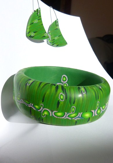 Je travaille en plus tout en haut d’une colline où  règne un micro climat et où le chasse neige passe… ou pas!   Alors là ça suffit! Comme pour inviter le soleil et le printemps à nous retrouver, voici une parure bracelet, boucles et bague VERT…ATTENTION les yeux!! C’est pas juste un peu vert, c’est bien vert…Allergiques au vert, partez vite!  mais moi, je veux du vert, vert feuille tendre, vert herbe fraiche!!!